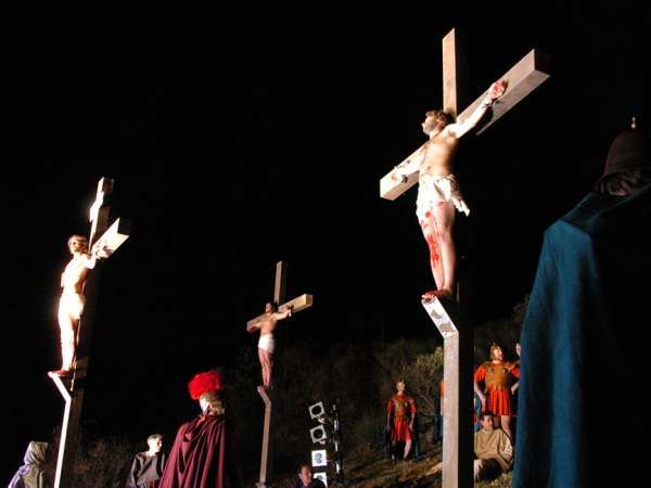 Figure esili, possenti soldati e centurioni, luccichii di donne romane, il quadro dei ladroni, i maestosi cavalli fanno da cornice ad un Cristo che ondeggia e soffre nei 90 minuti di percorrenza della Via Crucis. L'arrivo in prossimità del Calvario è il preludio della fusione dei due eventi fino allora separati (corteo e scene), che il coordinamento di una collaudata regia riesce tutti gli anni ad integrare con abilità e suggestione.
