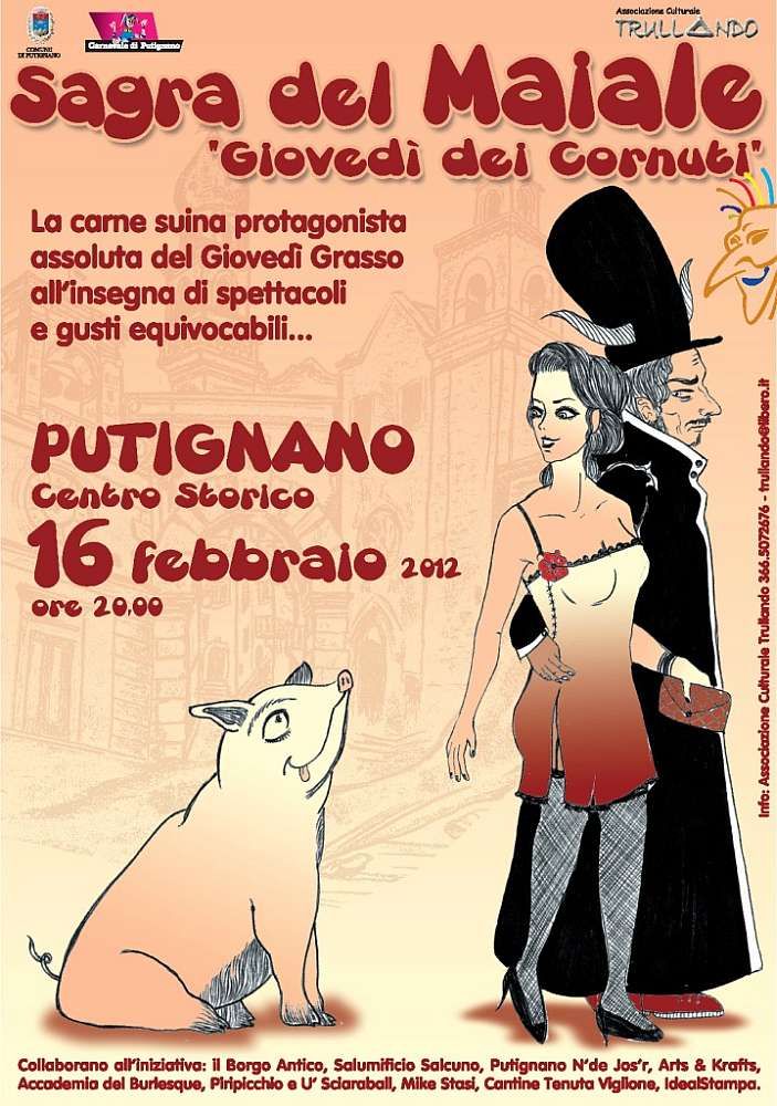 L'associazione culturale Trullando, in occasione del giovedì grasso, con il patrocinio della Fondazione del Carnevale di Putignano, proporrà la Sagra del Maiale.