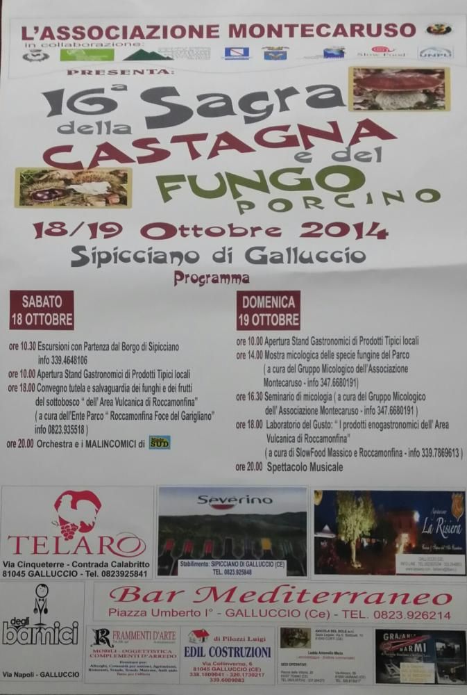 Nei vicoli dell'incantevole borgo medievale di Sipicciano di Galluccio (CE), un ecomuseo del patrimonio rurale ed ambientale nel cuore del Parco Regionale di Roccamonfina Foce Garigliano e della Comunità Montana "Monte Santa Croce" si svolge la XVI^ Sagra della Castagna e del Fungo Porcino, uno dei paesi dell'Alto Casertano con la maggiore produzione di castagne e raccolta del fungo porcino con marchio DOP.