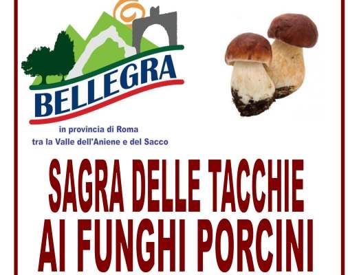 Si svolge a Bellegra, “Città dei Panorami” a 815 metri d’altezza tra la Valle del Sacco e la Valle dell’Aniene in provincia di Roma, nei Weekend di Sabato 30 Settembre e Domenica 1 Ottobre 2017 e Sabato 7 e Domenica 8 Ottobre 2017 in Piazza del Municipio, Piazza Giovanni Paolo II° e Piazza della Libertà, la undicesima edizione della “SAGRA DELLE TACCHIE AI FUNGHI PORCINI”, organizzata dalla Pro Loco di Bellegra, che celebra due prodotti gustosi e tipici della cucina e del territorio bellegrano. Le tacchie, nella antica ricetta delle nonne bellegrane, sono un tipo di pasta fatta a mano con acqua, farina e uova, che una volta “ammassate” vengono tagliate a mano in maniera casuale ma sempre in modo da darle la tipica forma a rettangoli irregolari. L’abbinamento classico che da sempre è caratteristico della cucina bellegrana è con i saporiti funghi porcini di cui i numerosi boschi di Bellegra sono ricchi in questo periodo dell’anno.