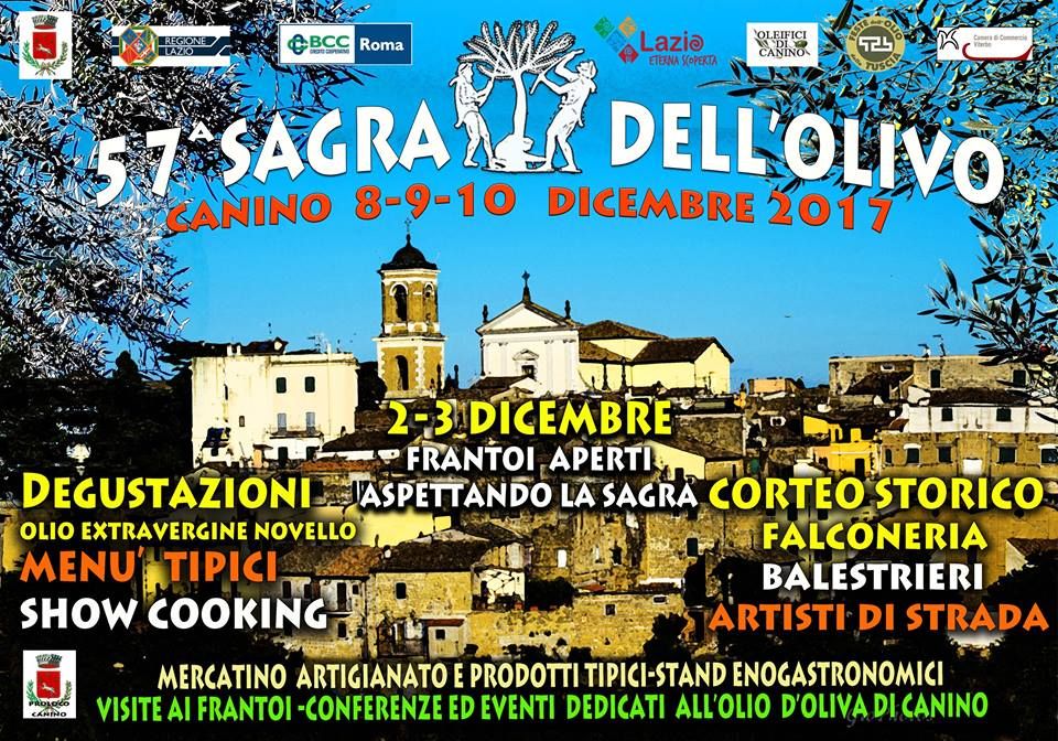 Nel paese che produce un olio extravergine d’oliva fra i più pregiati d’Italia, non potevano che organizzare una sagra dedicata all’olivo. Anzi, a Canino questa rappresenta “la” festa dell’anno per eccellenza: tre intere giornate dedicate all’oro verde della Maremma Laziale che tornano dall’8 al 10 dicembre con il consueto, ricco programma di degustazioni, intrattenimenti, convegni a tema e rievocazioni storiche; con uno stuzzicante antipasto il 2 e il 3 dicembre, con frantoi e cantine aperte “aspettando la sagra”. Giunta alla 57esima edizione, la manifestazione esalterà un prodotto che affonda le proprie radici in tradizioni culturali millenarie, in antiche ricette tramandate di padre in figlio e in un’economia che si basa ancora in gran parte sulla spremitura delle olive. Sarà possibile degustare l’olio novello, oltre che nei ristoranti tradizionali, anche nei tipici cantinoni aperti per l'occasione e nello stand della bruschetta, conoscerne da vicino il processo di produzione con le visite guidate all’interno dei frantoi, acquistarlo presso gli stand degli oleifici e gustarlo sulla bruschetta più grande del mondo; e non mancheranno gli assaggi guidati dell’olio nuovo e le degustazioni curate dalla scuola alberghiera.