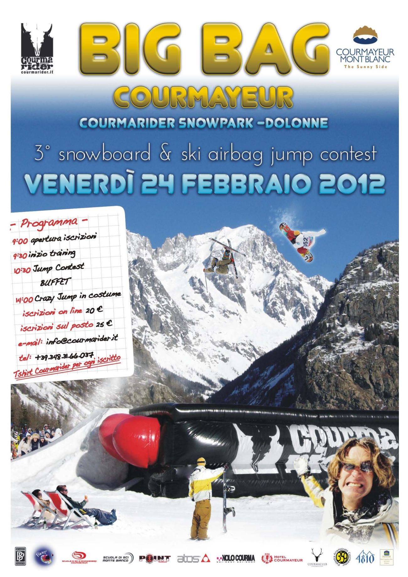 Venerdì 24 febbraio torna ai piedi del Monte Bianco il Big Bag Snowboard & Ski Jump Contest, arrivato alla terza edizione. Una gara all'ultimo salto, resa unica dall'atterraggio sul Big Air Bag, il materassone gonfiabile di 15 metri che domina il Courmarider Park, lo snowpark di Courmayeur. Sfide ma anche divertimento, grazie al “Crazy Jump in costume”, la gara riservata alle esibizioni in maschera.