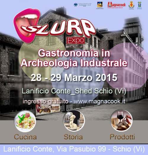 Il 28 e il 29 marzo 2015 a SLURP EXPO 2015 si daranno appuntamento i migliori operatori nazionali dell'alta gastronomia, ma anche il sempre più vasto e appassionato pubblico dei foodies per un grande incontro dedicato ai sapori tipici d’Italia, 60 espositori selezionati  per l’alta qualità della loro produzione, si daranno appuntamento nello SPAZIO SHED DEL LANIFICIO CONTE DI SCHIO, per mostrare e degustare eccellenze gastronomiche sia tipicamente venete che italiane per un viaggio nei sapori d’Italia, tra degustazioni, mostra mercato, show cooking interattivi, incontri dedicati alla birra, al cake design e molto altro con esperti del settore; è quel che aspetta gli enogastronauti nell’ area industriale del Nord Est, per un viaggio in cui poter conoscere da vicinissimo il patrimonio di storia e cultura che il vino ed il cibo rappresentano per l’Italia intera, simboli indiscussi del "made in Italy" nel mondo.