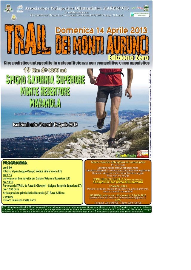 il “Trail dei Monti Aurunci” , giro podistico in autosufficienza non competitivo e non agonistico, con partenza da Spigno Saturnia Superiore (LT) e arrivo a Maranola (LT) per una distanza di 19 km circa e un dislivello positivo di circa 1.200 mt., articolato quasi interamente su sentieri di montagna (rocciosi, strade bianche e 10% asfalto) all’interno del Parco Naturale dei Monti Aurunci.