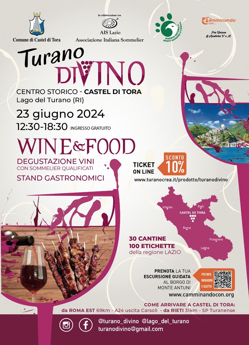 Il 23 giugno mettete in agenda! Avete due opzioni: festeggiare la ricorrenza della scoperta dell'acqua su Marte o brindare al ritorno di “Turano diVino”. Noi optiamo per la seconda! 100 etichette, 30 cantine e fiumi di vino. Bianco, rosso, rosè e bollicine. A ciascuno il suo. Ed è “cin cin” a “Turano diVino” il 23 giugno dalle 12,30 alle 18,30. Ogni bicchiere sarà accompagnato dalla voce esperta di un sommelier che ve lo racconterà. Che siano note di ciliegio o chissà se di pesca o albicocca, assaporatele e ascoltate”le”, sarà un viaggio sensoriale attraverso la storia e la cultura del vino. La manifestazione vuole valorizzare il territorio attraverso la degustazione di pregiati vini e la scoperta di prodotti gastronomici locali e non solo, di certo genuini. Arrosticini, patatine fritte, farro, pane cunzato, ciambelle tipiche del territorio e altro. È presente anche uno stand senza glutine.