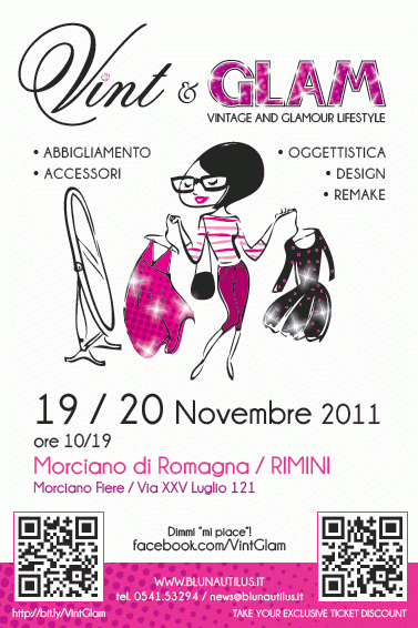 Rimini, da sempre osservatorio privilegiato dei fenomeni di costume, dedica un fine settimana alla vintage culture con Vint&Glam, un nuovo evento che vedrà protagonisti, sabato 19 e domenica 20 novembre 2011 a Morciano Fiere (Morciano di Romagna - RN) una cinquantina di espositori di abbigliamento, accessori, oggettistica, design ed editoria declinati al passato, recente o remoto.