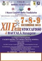 Ritorna la Festa dello Stoccafisso e Baccalà Norvegese, e giunge alla XII edizione. La tre giorni (7-8-9 dicembre 2012) organizzata dal comitato I Nuovi Sapori della Tradizione con la straordinaria partecipazione di Scanfish, F.lli D’Avino e I Nuovi Delfini, aziende leader nel settore della preparazione e commercializzazione del merluzzo nordico, di concerto con le associazioni Vesuvia Pro Loco, C.S. Villa Summa, La Voce del Territorio, La Soffitta in Piazza, e con il patrocinio morale del Comune di Somma Vesuviana (Assessorato Turismo e Spettacolo), Regione Campania, Provincia di Napoli, Confcommercio Campania, Ente Parco Nazionale del Vesuvio, da sempre dedicata all’arte della lavorazione del pesce artico, non si terrà in piazza Vittorio Emanuele III, ma presso l’agriturismo “Scuderia Monte Somma”.