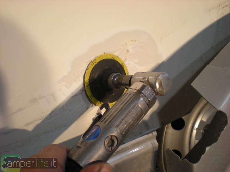 Con una piccola levigatrice ho eliminato le parti semi staccate e nello stesso tempo ho preparato la base sulla quale attaccare la pezza di fibra di vetro. Sarebbe sufficiente opacizzare ma visto che deve durare nel tempo è meglio graffiare bene per garantire una maggiore aderenza della resina.