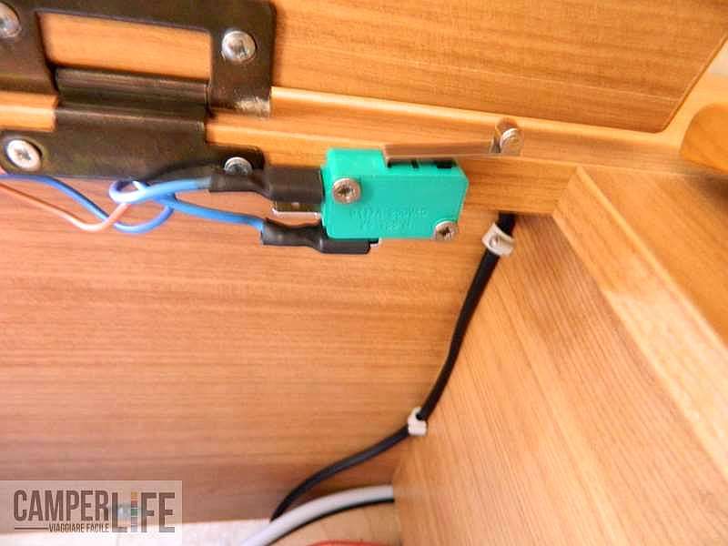 Poi abbiamo installato dei micro switch di fine corsa con rotella, affinchè agendo sugli sportelli non danneggino il legno: per interrompere il positivo abbiamo derivato un filo dalla linea del positivo, inserendolo nell’ingresso comune dello switch; un altro filo è stato derivato dal positivo della striscia led e inserito nell’ingresso normalmente chiuso dell’interruttore. Effettuate queste operazioni, dobbiamo far passare un cavo bipolare: noi abbiamo usato un 2x0,75 mmq, vista la bassa tensione che vi circola, e lo abbiamo collegato alla linea delle luci del nostro camper,  interponendo sempre sul positivo un fusibile da 5A, che intervenga in caso di cortocircuito o sovraccarico, evitando spiacevoli conseguenze.  Avremo così all’apertura dell’anta una gradevole luce, che renderà ben visibile il contenuto dello stipetto.