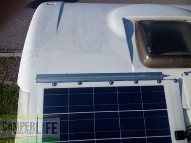 I pannelli si possono anche accorciare un po', con una forbice taglia lamiera o con un taglierino, in quanto la ditta li fornisce abbastanza larghi. Sono stati scelti i profili di alluminio per far girare un po' d'aria sotto il pannello stesso, in modo da non farlo scaldare molto, e di conseguenza da non trasferire il calore all'interno della mansarda: nel nostro caso, abbiamo scelto di posizionarli tra la mansarda e il tetto, su un Laika 2.1, così da non appesantire troppo il tetto stesso, essendo già presente, come in quasi tutti i camper, oggi, l'aria condizionata, l'antenna, e soprattutto essendo un tetto calpestabile. Anche per questo la scelta è caduta sui pannelli flex, per il loro peso, decisamente trascurabile.