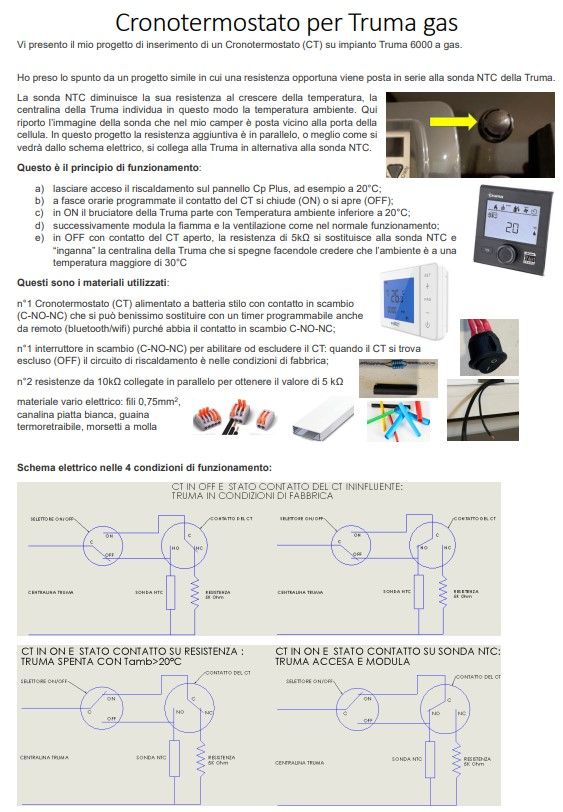 Riscaldamento e Condizionamento 18 Febbraio 2023 Cronotermostato per Truma a gas Cronotermostato per Truma gas Vi presento il mio progetto di inserimento di un Cronotermostato (CT) su impianto Truma 6000 a gas. Grazie per la lettura. Eugenio Foto
