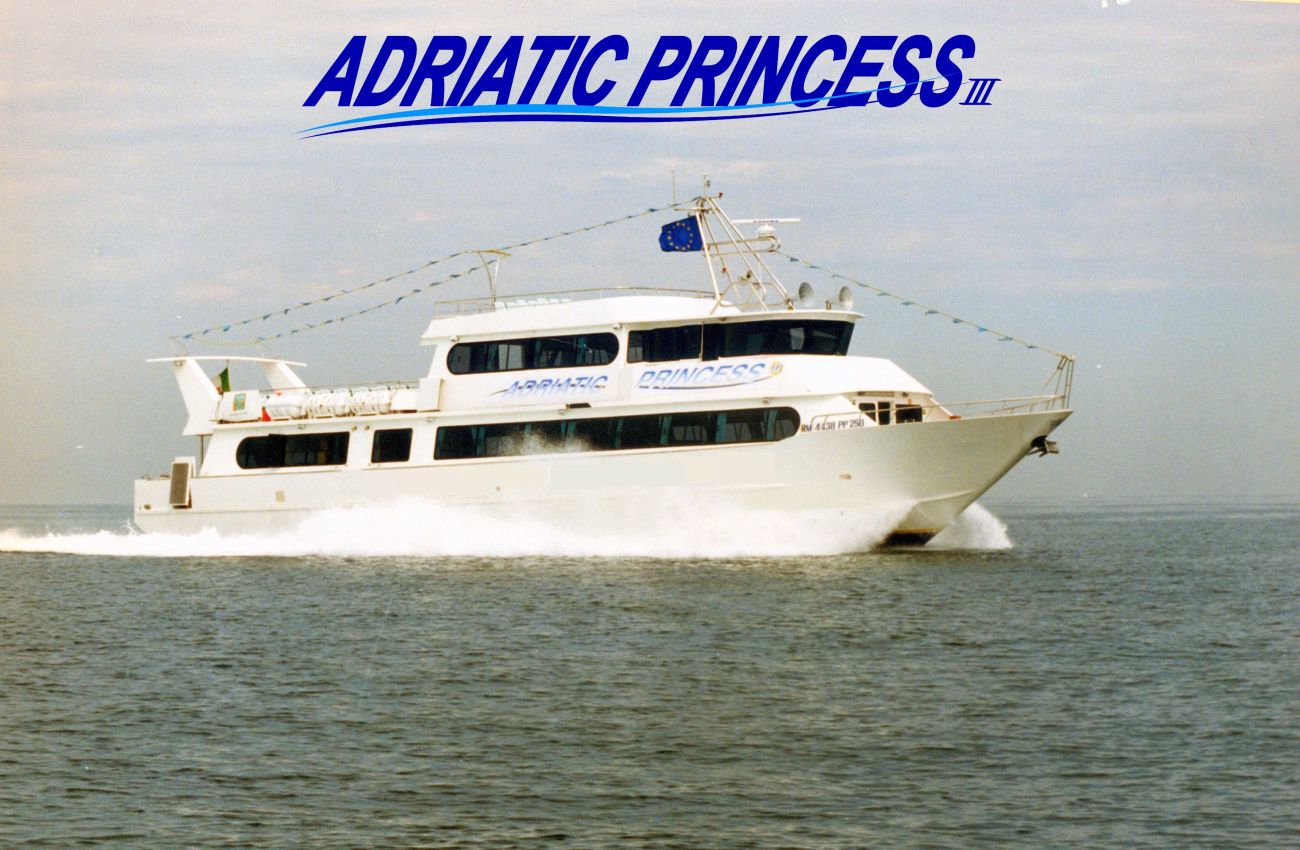 Descrizione: La motonave Adriatic Princess III, costruita nel 2002, è la più moderna, grande e spaziosa motonave trasporto passeggeri in servizio sulla costa dell'Emilia Romagna. Da Cesenatico e le spiagge di Villamarina di Cesenatico e Gatteo Mare, si salpa verso quelle mete che sono le più suggestive di tutto l'alto Adriatico, lungo la costa romagnola, sconfinando nel Veneto e nelle Marche, con la possibilità di gustare a bordo la cucina marinara locale.