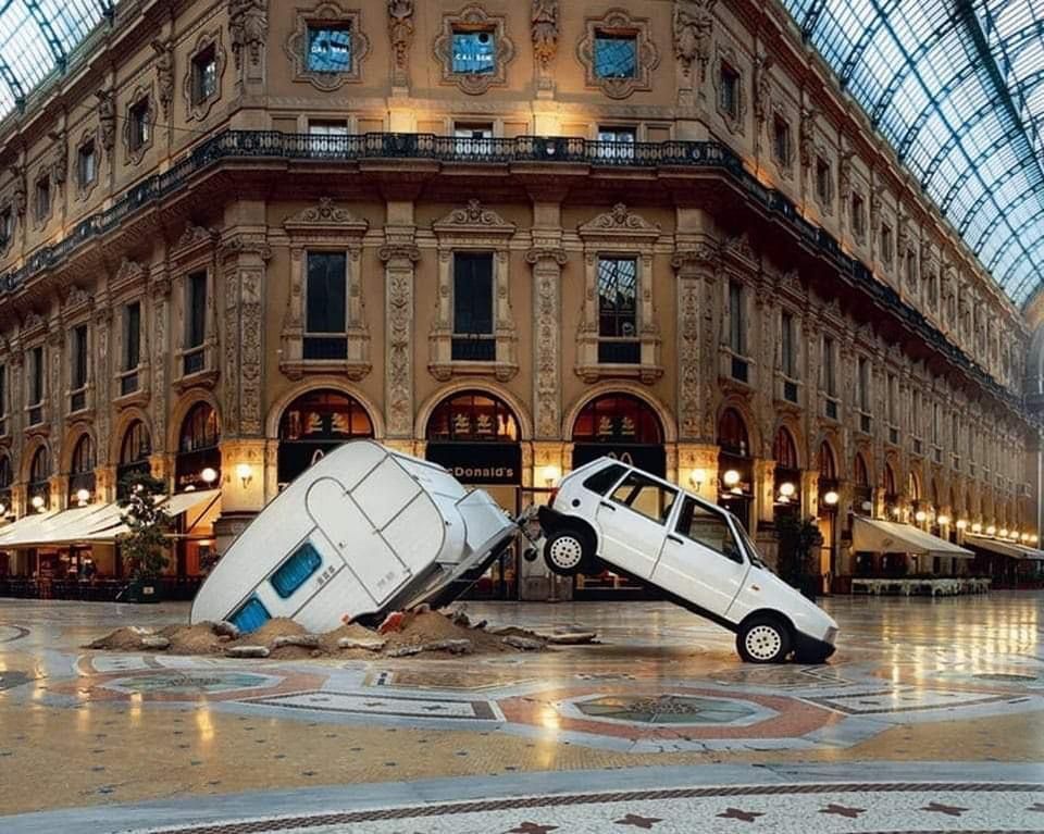 Con l’installazione di un’automobile bianca che traina una roulotte, che spuntano al centro dell’Ottagono della Galleria Vittorio Emanuele dopo un lungo viaggio immaginario al centro della terra, Michael Elmgreen & Ingar Dragset disegnano un’incursione unica nella vita quotidiana di Milano e nella sua storia, rileggendo uno dei simboli della città.