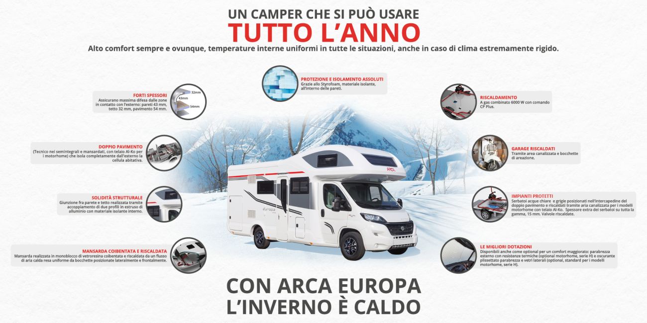 Arca pensa ai molti camperisti che amano le vacanze invernali e lancia sul mercato la nuova gamma Europa, composta da 11 modelli, disponibili in versione mansardata, semintegrale e motorhome e adatti ai climi più rigidi.