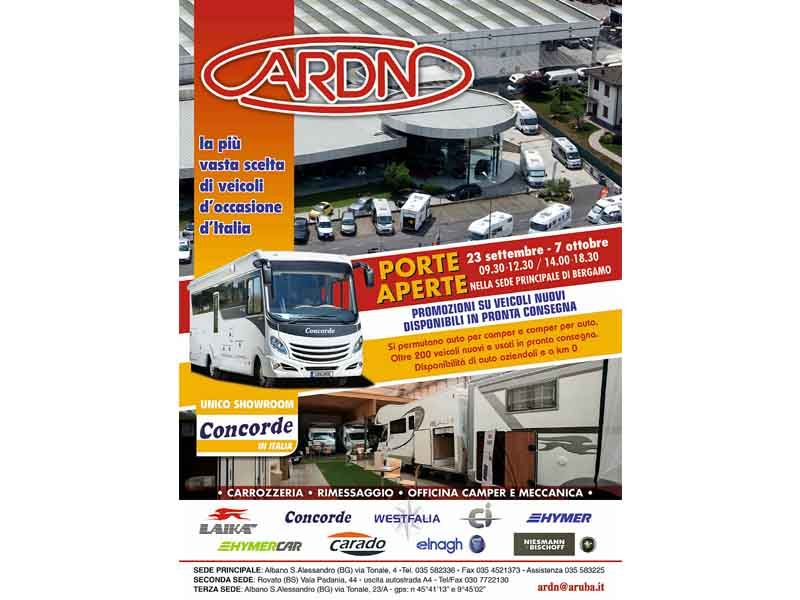 Dal 23 settembre al 7 ottobre ARDN, concessionaria con sede principale a Albano S. Alessandro (BG), terrà un porte aperte dedicato a tutti coloro che vogliono toccare con mano ed acquistare i veicoli visti presso il Salone del Camper. Ma non solo, perché i clienti potranno approfittare di promozioni e sconti su veicoli nuovi in pronta consegna, permutare auto per camper e viceversa, visitare il fornitissimo market accessori. Inoltre ARDN è l’unico showroom del marchio Concorde in Italia, oltre ad essere concessionaria Laika, Hymercar, Carado, Westfalia, CI, Hymer, Elnagh, Niesmann+Bischoff.