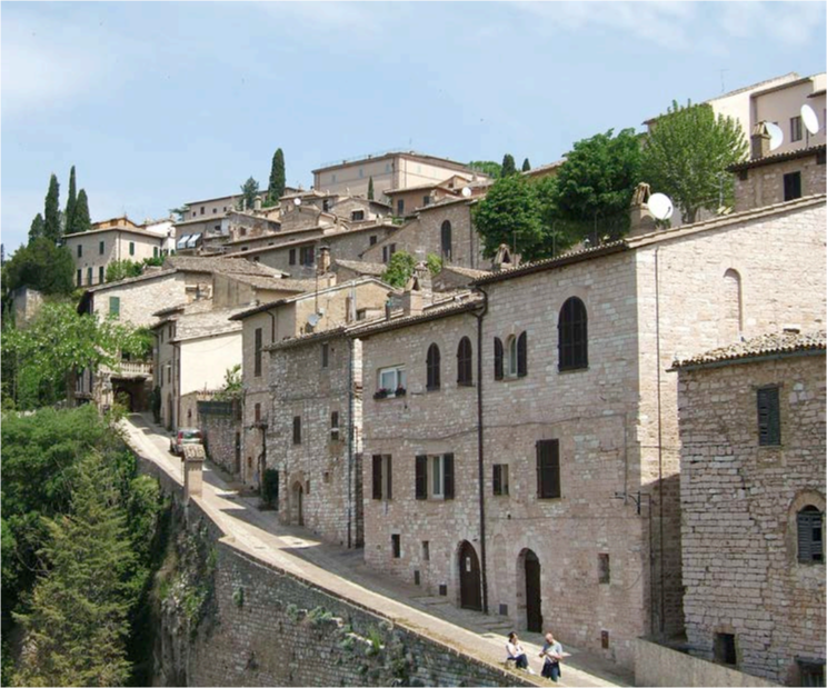 Inforcata la bicicletta e pedalando lungo il bel percorso cicloturistico, si giunge facilmente e senza troppa fatica ad Assisi. L’arrivo è spettacolare. Ormai al termine, quasi all’improvviso emerge dal verde argenteo delle colline ricoperte di ulivi la mole bianco-rosata del convento e della Basilica di San Francesco. Troneggia alta, e già eleva lo spirito di chi la osserva meravigliato. Assisi non ha bisogno di grandi presentazioni, come non ne ha bisogno il più famoso personaggio che qui ha vissuto, San Francesco. Non può sfuggire alla visita la Basilica Papale di San Francesco, uno scrigno prezioso di spiritualità, storia e arte, che racchiude tesori di altissimo valore fra cui i cicli di affreschi di Giotto. La Basilica Inferiore è di linee romaniche, la Basilica Superiore è in stile gotico ed entrambe sono densamente decorate da dipinti che narrano l’avventura spirituale ed umana di San Francesco. Fra gli altri luoghi di intensa spiritualità, la Basilica di Santa Chiara e la Basilica di Santa Maria degli Angeli in Porziuncola, quest’ultima lontana circa quattro chilometri dal centro, nella piana. Sulla sommità di Assisi si trova la Rocca Maggiore, fortezza di probabile origine longobarda, e dalle sue torri si ammira un panorama vastissimo su Assisi, raccolta ai suoi piedi, e su tutta la Valle Umbra. Nonostante Assisi sia spesso gremita di turisti e di pellegrini, una passeggiata lungo i suoi vicoli, specie quelli più defilati e silenziosi, è piacevole e carica di sorprese.