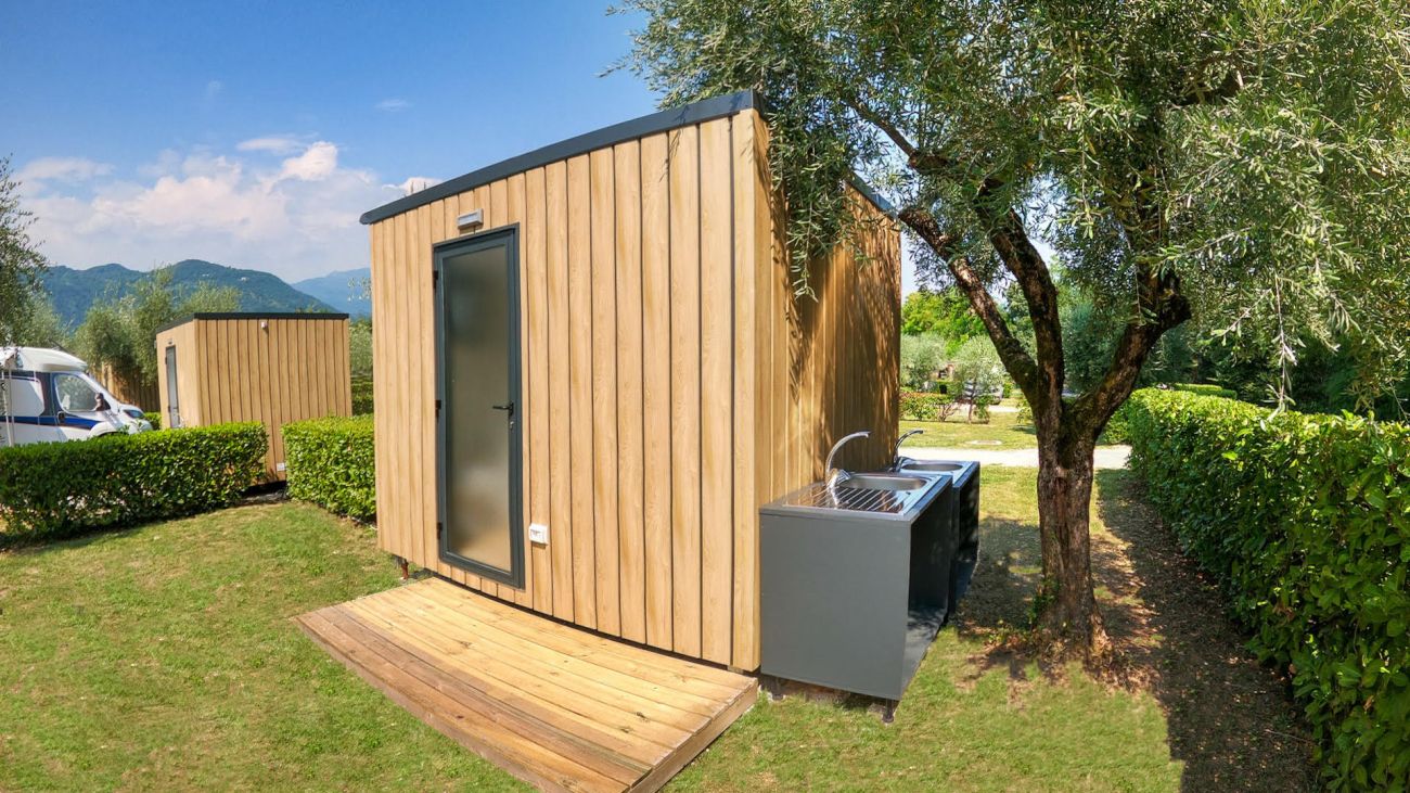 Dal design confortevole, mantenendo misure compatte, è dotato di lavabo, wc, bidet, ampia cabina doccia, asciugacapelli, termo-arredo, predisposizione per lavatrice/lavasciuga direttamente in piazzola. Creato con componenti completamente riciclabili a fine ciclo vita, permette all’ospite di godere di un nuovo spazio personale e ad alto livello di privacy all’interno del proprio spazio privato in campeggio.