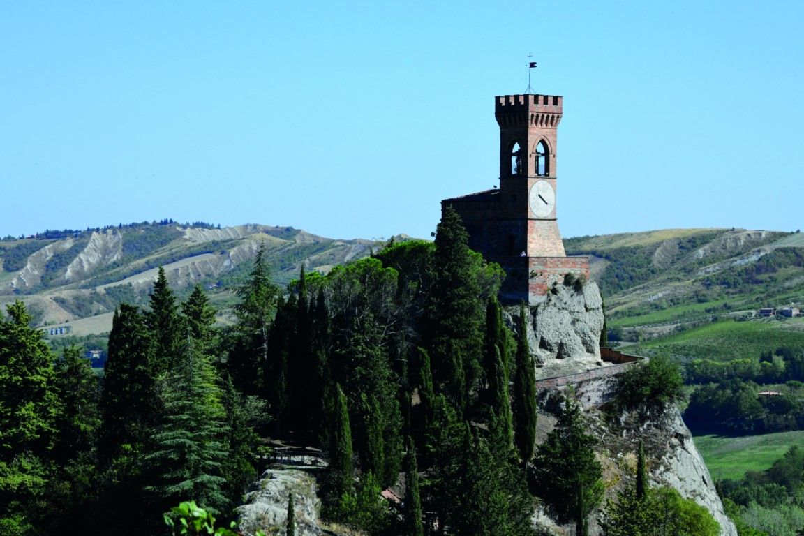 Tornati indietro, si continua in salita e superato il Teatro si sale lungo una scalinata che porta rapidamente (e ripidamente) alla Torre dell’Orologio (150 m) ricostruito nell’Ottocento sui resti di una più antica torre difensiva, e oggi punto privilegiato per un colpo d’occhio spettacolare su Brisighella, sulla Rocca Manfrediana che si erge di fronte su una collina boscosa da un lato e coltivata a viti e ulivi dall’altra e sulle colline che digradano in lontananza. Superata la torre, si raggiunge una placida strada bianca che con andamento graduale, bordata da cipressi, porta al parcheggio nei pressi della mole della Rocca. Per il momento la lasciamo da parte e la potremo scoprire meglio al ritorno dall’anello che andremo a percorrere.
