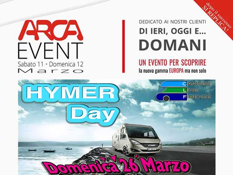 Sabato 11 e domenica 12 marzo presso Fly Camper sarà la volta degli Arca Event che mostreranno ai partacipanti la linea Europa, ma non solo: i clienti Arca che passeranno presso la sede del concessionario saranno premiati con un controllo infiltrazioni gratuito e un'esclusiva promozione sui ricambi originali. Il 25 e il 26 marzo, è in programma invece un porte aperte a Camper Line Firenze che consentirà ai visitatori di toccare con mano diversi modelli della gamma Hymer.