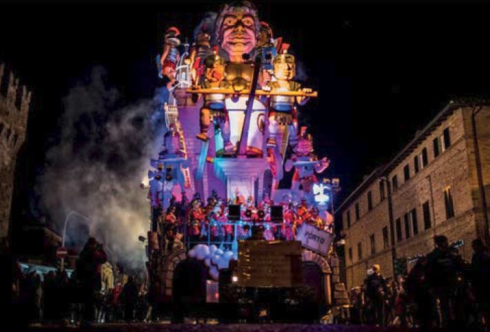 Ben 200 quintali di dolciumi che piovono sulla folla in maschera. È questo il “getto”, l’evento più caratteristico del carnevale di Fano che prevede anche sfilate di enormi carri allegorici di cartapesta alti fino a 18 metri. Per tre domeniche (12, 19 e 26 febbraio 2017) circa 150mila visitatori assisteranno alle coinvolgenti sfilate dei carri che percorrono il viale più colorato d’Italia. Si inizia al mattino con il Carnevale dei Bambini con carri e mascherate su misura, per poi continuare la sera con la sfilata dei “giganti” della cartapesta. Meno importanti ma sempre di successo sono il Carnevale dei Nonni e quello degli Animali, che ha avuto il suo esordio tre edizioni fa. Il carnevale di Fano ha una lunghissima tradizione: uno dei primi documenti risale al 1347 ed è conservato nell’Archivio storico comunale. Nei secoli è cambiato il luogo delle sfilate, dal centro storico al più ampio e suggestivo viale Gramsci, e il tipo di “getto”, da quello dei confetti a quello di cioccolatini e caramelle. Tra le tradizioni su cui i fanesi non discutono c’è la presenza alle sfilate della Musica Arabita, banda folkloristica nata nel 1923 che, facendo il verso ai salotti aristocratici, s’inventò la propria musica con oggetti poveri e di recupero, e il rito purificatore del “Rogo del Pupo” durante il quale, nell’ultimo giorno di festa, il Martedì Grasso, nella piazza centrale viene bruciato un fantoccio per permettere agli abitanti di espiare le proprie colpe e dare inizio al periodo di Quaresima. Per l’occasione è stato organizzato un raduno camper che si svolge durante la festa.