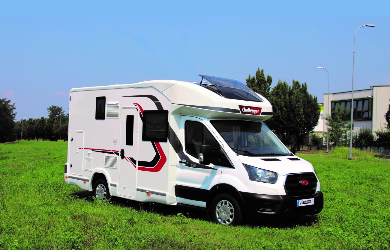 Tra le moltissime varianti dei semintegrali Challenger propone una serie denominata Maxi Salone che, grazie ad uno stravolgimento delle classiche piante, punta ad un target come la coppia moderna in cerca di un mezzo funzionale fuori dagli schemi. Offerta nelle versioni 250, 260, 270 e 380, hanno in comune il soggiorno con dinette face to face ed il letto che basculante che scende sopra il salotto, che sia matrimoniale o gemelli, e per le prime tre versioni il bagno trasversale in coda. In questo colpo d’occhio vi illustreremo il modello 250, il più compatto con i suoi 640 cm, nella versione Start Edition su meccanica Ford Transit. La versione Start è già abbastanza accessoriata, nonostante il nome, ma per i più esigenti possono puntare al top di gamma, la Graphite Premium che, oltre ad avere praticamente tutto dal punto di vista accessoristico, ha anche un bel incremento di meccanica, con il Transit che passa a 170 cavalli e addirittura con il cambio automatico. Nel mezzo si trova la versione Graphite Vip, che però è su Fiat Ducato. Per quanto riguarda la cellula troviamo il sistema di costruzione IRP, ossatura in legno/composito ed isolamento Styrofoam, Polyestere rinforzato su pavimento da 64mm e tetto da 55mm. Come tutte le cellule del marchio ha la certificazione con normativa EN 1646-1 sezione 9 per la classificazione dell’isolamento termico e del riscaldamento, avendo superato i test di grado 3. Il cupolino rastremato e proporzionato con le dimensioni del mezzo, regalano una linea filante, con l’accattivante frontale del Transit. Le finestre Seitz e la porta d’ingresso XL con gradino d’accesso integrato, sono ulteriori particolari che confermano la bontà dell’allestimento Start.