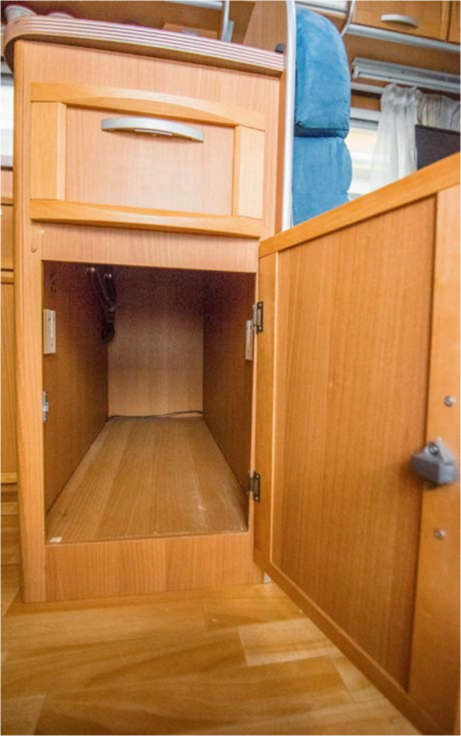 Alcune case costruttrici hanno preferito utilizzare un sistema scorrevole, ovvero un cestello di tipo casalingo, da riempire a piacere, in questo modo lo spazio disponibile viene portato fuori in modo da poter essere facilmente accessibile, altrimenti una volta posizionato un oggetto nel fondo dell’angolo occorre sdraiarsi per recuperarlo. La profondità del vano impone un cesto o cassetto scorrevole di notevoli dimensioni per sfruttare lo spazio, ma vi è il limite della larghezza della cellula per poterlo estrarre del tutto, e quindi si arriva ad una via di mezzo. Inoltre le guide devono essere robuste e ancorate in dei rinforzi, perché il peso a sbalzo, vista la tendenza a sovraccaricare, può farle lavorare male o allentare gli attacchi. Una soluzione adottata in fase progettuale è quella di ridurre la profondità a dimensioni normali, e trasformare lo spazio rimasto in vano tecnico, dove magari posizionare la stufa, che però diventa scomoda in caso di manutenzione. Per chi invece ha uno dei primi camper con cucina angolare, dove non è stata prevista nessuna soluzione, cosa fare per evitare contorsionismi da corridoio? Un’idea potrebbe essere quella proposta da un artigiano, professionista del settore come Caravan Camper 2, che su richiesta di un cliente ha progettato una soluzione applicabile a moltissimi modelli in circolazione.