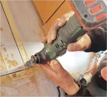 Si è partiti analizzando la struttura portante del doppio pavimento, una volta individuati i rinforzi si è provveduto a disegnare l’ingombro massimo dell’apertura, in modo che il vano non interferisse con i piedini di rinforzo che si trovano tra i due strati del pavimento, composto da quello interno verso la cellula e quello esterno verso la meccanica. Il disegno ottenuto, una volta messo in squadra per assicurarsi che sia parallelo con il mobilio della cucina, viene contornato con del nastro protettivo, per evitare che durante la fase di taglio ci sia alcuna sbavatura.