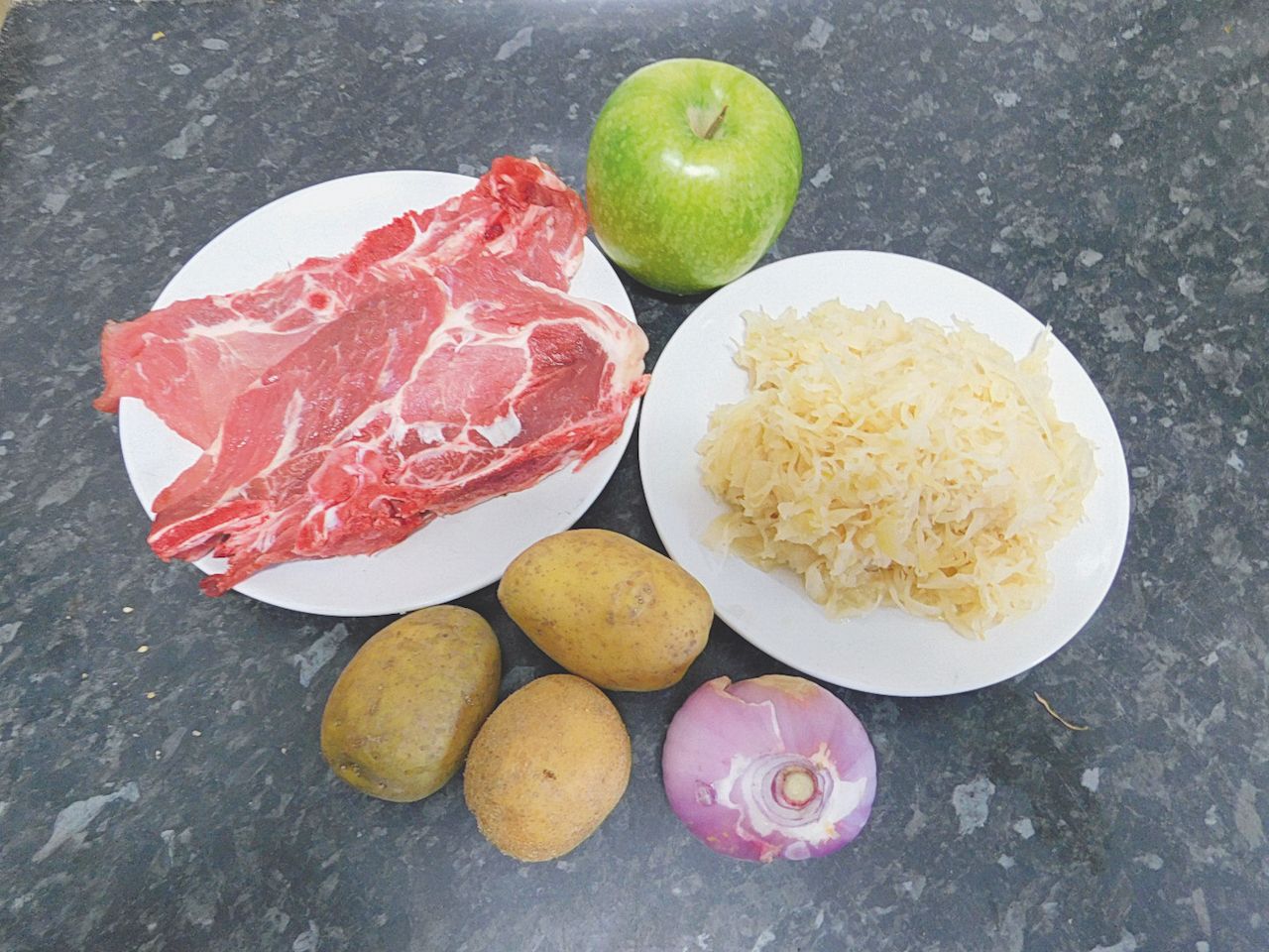 La ricetta che voglio proporvi questo mese è quindi qualcosa di simile a un piatto tedesco, si tratta di cotolette di maiale con crauti, patate e mele verdi.