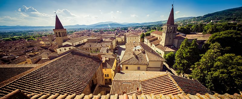 Una volta lasciato il mezzo a riposare, andate verso via Petri e lì troverete delle comodissime scale mobili che vi aiuteranno a salire i 305m di altezza del colle San Donato, l’altura su cui sorgono le case storiche di Arezzo: il colpo d’occhio è molto bello e si spazia da mura medievali circondate da parchi a tetti in mattoni che sormontano case basse color ocra. Vedrete subito stagliarsi contro il blu del cielo un campanile a punta e un torrione ricco di finestre a doppio arco (dette bifore): varcata la soglia di questo quartiere dai colori terrosi, inizia la vostra visita alla città.