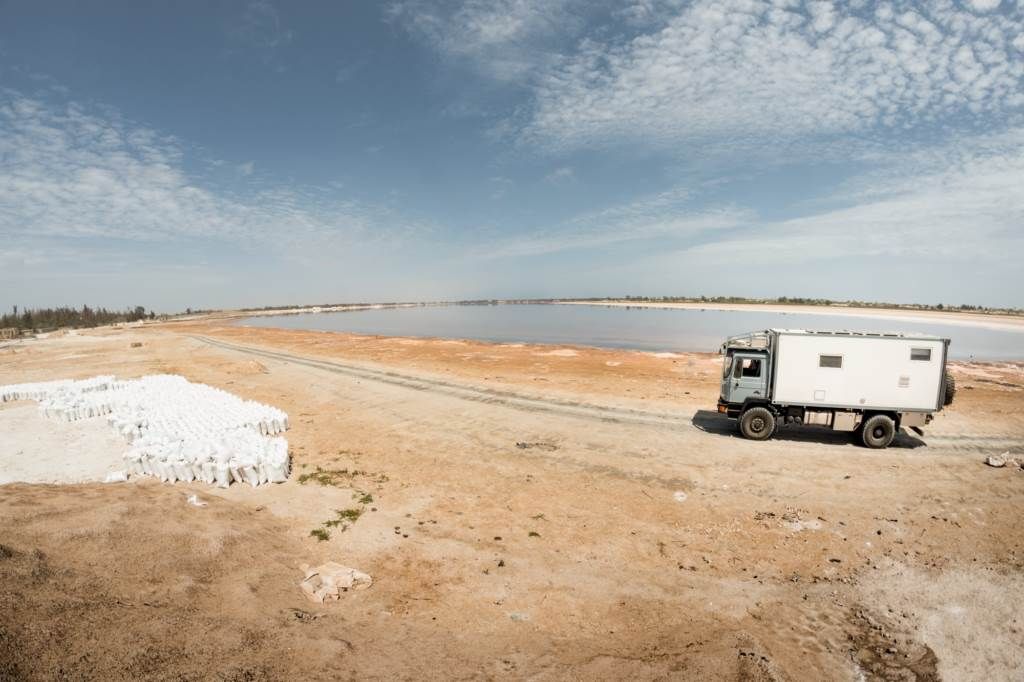 potrebbero passare con facilità, tuttavia ormai è il mese di maggio inoltrato e il caldo inizia ad arrivare insieme all’umidità e quindi decidiamo di muoverci più a Sud cercando di sfruttare per quanto possibile la corrente fresca che proviene dall’Oceano. Sfruttando un po’ delle capacità fuoristradistiche del nostro veicolo, procediamo lungo una pista costiera evitando in questo modo la trafficata strada principale che collega St Louis a Dakar. Ci fermiamo qualche notte lungo la spiaggia e qui rimaniamo in piena solitudine protetti dalle dune che si trovano tra noi e l’Oceano Atlantico. Proseguiamo più a Sud, in direzione del famoso Lago Rosa, luogo che per noi significa il ricordo di uno dei Rally più famosi del mondo, la Parigi-Dakar, che proprio qui andava a terminare il suo lungo tragitto africano. Prima di raggiungere il Lago Rosa attraversiamo qualche piccolo paese dove ci capita sovente di venire