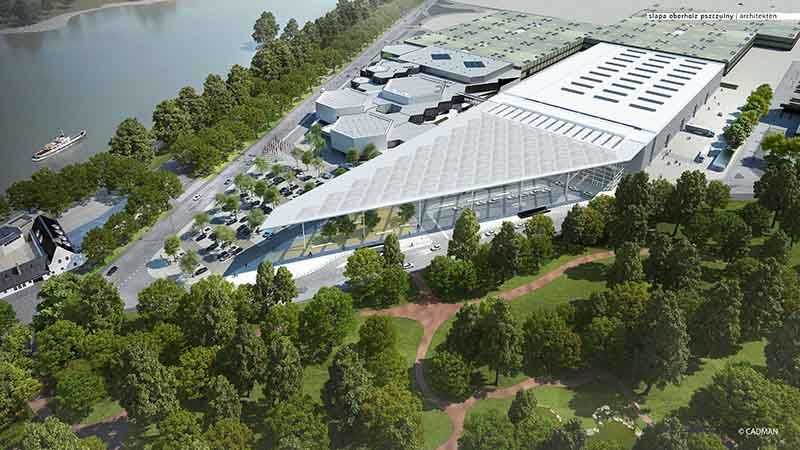L’entrata Sud e il padiglione 1 saranno completamente ricostruiti. Werner M. Dornscheidt, amministratore delegato di Messe Düsseldorf GmbH, è molto soddisfatto: "Possiamo adesso”, ha detto, “implementare il nostro masterplan per il completo ammodernamento e rinnovamento dei locali e, come sempre, senza sovvenzioni. "Il volume di investimento di questa sezione è di 140 milioni di euro. Nel complesso Messe Düsseldorf investirà circa 636 milioni di euro fino al 2030. Il lavoro inizierà nel maggio 2017 e dovrebbe essere completato nell'estate del 2019. Il progetto è stato creato dalla società architettonica Slapa oberholz pszczulny architekten di Düsseldorf. Il nuovo ingresso Sud darà alla fiera una presenza direttamente sulle rive del fiume Reno con una prospettiva verso Düsseldorf. Sarà una pensilina trasparente di 7.800 metri quadrati a circa 20 metri di altezza, e sarà una potente icona architettonica molto visibile del centro fieristico. L'ingresso Sud sarà aperto verso il cortile esterno attraverso un davanti completamente satinato di 93 metri di lunghezza. Oltre 2.000 metri quadrati di spazio accoglieranno tutti i servizi necessari, come bancomat e guardaroba. Il primo piano avrà una sala riunioni recintata in vetro che daranno sul foyer, offrendo una vista della zona d'ingresso fino al piazzale esterno. Inoltre l'intero foyer potrà essere utilizzato per eventi. Il piazzale ospiterà l'ingresso di un parcheggio sotterraneo con 300 spazi così come fermate di autobus e taxi.