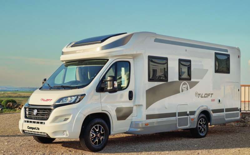 Piacevoli e ben curati, sono sobriamente eleganti ma senza sfarzi inutili, con gli arredi a contrasto tra profili in legno e superfici lucide di pensili e piani e maniglie cromate. L’illuminazione a LED è molto curata e presenta finiture pregiate come i profili sulla testiera del letto posteriore o quello tra cucina e dinette. La tappezzeria standard è in microfibra, in opzione è possibile richiedere quella in ecopelle. Lo spazio del living è piuttosto ampio e il tavolo ripiegabile a libro aumenta la vivibilità e la comodità di muoversi quando non è in uso. I pensili, cosa piuttosto rara, hanno una forma concava anziché convessa come la stragrande maggioranza se non sono piatti, particolare che risalta all’occhio come dettaglio di stile che firma questo T-Loft. Tutta la zona centrale prende luce dal grande oblò skyroof anteriore, oltre che dalle finestre laterali e della porta, dato che sul soffitto sopra la dinette è posizionato il letto basculante, rifinito con un grande pannello a specchio con LED integrati sulla faccia inferiore che aumenta la sensazione di spazio. Completamente rinnovato anche il pannello sul mobile di ingresso, con un grande specchio sagomato e luci a LED integrate. Ciliegina sulla torta, gli altoparlanti audio incassati nel profilo dei pensili sopra la dinette e già cablati.