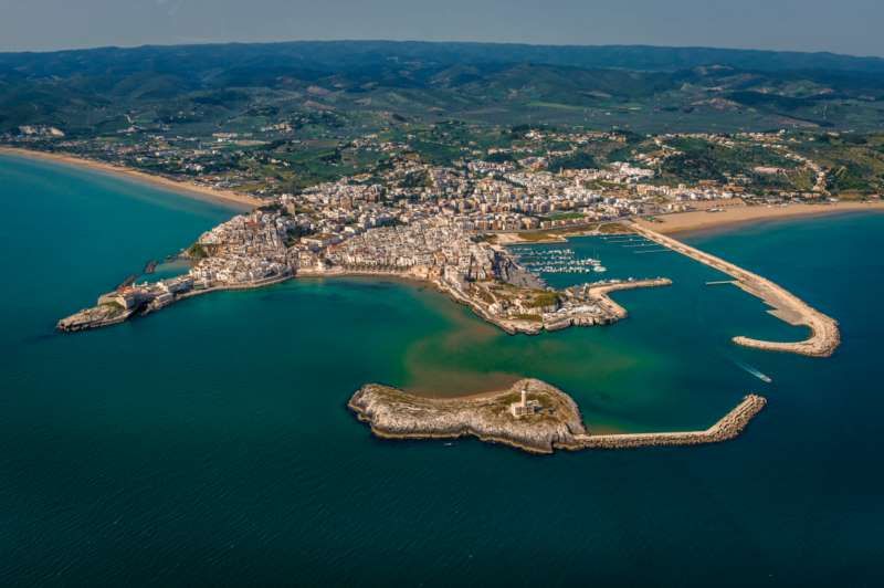 attuali confini della provincia di Foggia fin da tempi remoti. Le sue case dal bianco accecante terminano all’improvviso al bordo di una falesia a strapiombo sul mare e si arrampicano su una collina piena di fichi d’india, mandorli e ulivi. Il centro storico, chiamato Junno, custodisce, tra palazzi nobiliari come palazzo Beretta e palazzo Mantuano costruito nel 1840, alcune costruzioni tipiche della zona risalenti alla metà del XVIII secolo: sono i “pagghiéri”, pagliai, edifici bassi in pietra calcarea a secco, a base rettangolare, appartenenti alla cultura contadina. Il paese, edificato a strati e gradoni ricavati dalla roccia sulle colline di Castellacelo e di Coppa della Madonna, è circondato dal Monte Sacro e dal Monte Saraceno. Sulla sommità del primo, tra la fitta vegetazione spontanea, si ammirano le rovine di un’antica abbazia benedettina, mentre sul Monte Saraceno si trova una necropoli di 500 tombe dell’età del bronzo che testimonia la presenza della civiltà dei Dauni. La festa patronale del paese, dedicata a Santa Maria della Luce, si tiene ogni anno a metà settembre ed è un momento tradizionale molto partecipato: accanto ai concerti di musica classica e leggera e ai fuochi d’artificio, si svolge la sacra processione del quadro della Madonna e delle statue di Sant’Antonio e di San Michele Arcangelo.