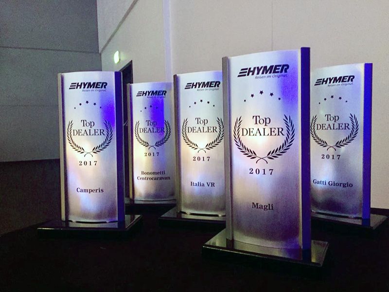 In occasione del meeting, Hymer ha ringraziato tutti i concessionari italiani e premiato i 6 Top Dealer, che si sono distinti per numero di vendite, qualità dell’esposizione e assistenza alla clientela. Un riconoscimento importante per la rete vendita italiana che, nell’anno del 60° anniversario dell’azienda, ha collaborato al raggiungimento di traguardi di rilievo. Si parla infatti di una crescita del 19% per quanto riguarda le vendite di veicoli Hymer, Hymercar ed Eriba. In particolare Hymer ha premiato Bonometti (Vicenza - Trento), Camperis (Modena - Matera), Camping Sport Magenta Srl (Magenta, MI), Gatti Giorgio (San Giuliano Vecchio, AL), Italia VR Group (Druento, TO) e Magli (Ozzano Emilia, BO). Recente è poi l’inserimento nella rete vendita del concessionario abruzzese CamperLike e del concessionario toscano Fly Camper.