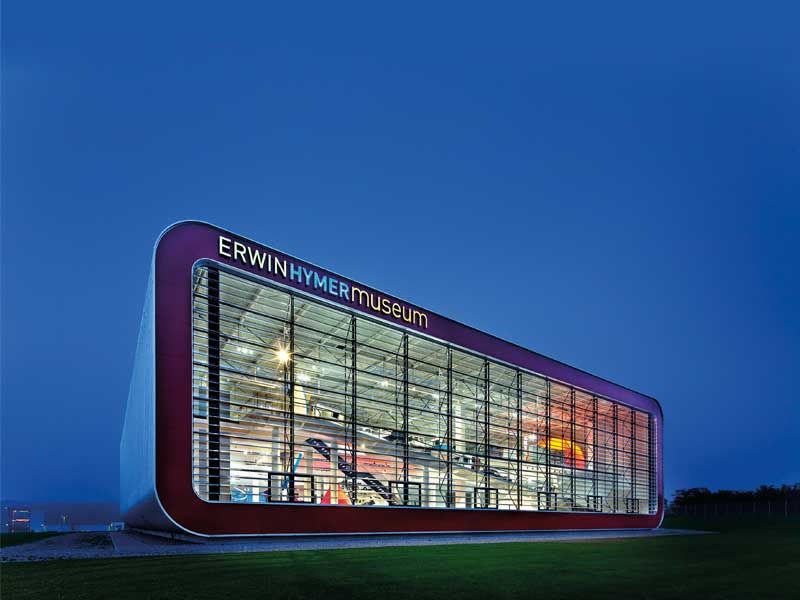 L’edificio che ospita l’Erwin Hymer Foundation, che si estende in totale per circa 10mila mq, cattura subito lo sguardo del turista in visita grazie soprattutto all’immensa luminosità che lo contraddistingue. Architetturalmente parlando, il complesso museale consiste in due edifici e simula una finestra orizzontale e una verticale di una caravan. Le facciate nord e sud sono completamente vetrate, il che consente ai visitatori di intravedere l’interno della struttura già da lontano. Una volta all’interno, invece, possono godere di un bel panorama su Bad Waldsee e, in caso di ottime condizioni di visibilità, persino sulle Alpi. L’edificio più piccolo è a un solo piano ed è lungo 75 metri, alto 11 metri e profondo 50 metri. È caratterizzato da un guscio esterno in vetro con retroilluminazione. Il secondo edificio invece è a due piani, lungo e profondo 60 metri e alto 19 metri. Infine le pareti a est e a ovest si illuminano grazie alla facciata in acciaio inossidabile goffrato.