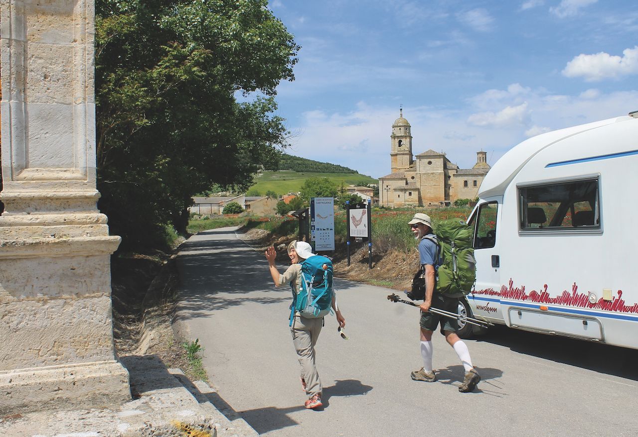Anche noi, nonostante l'ausilio del camper, siamo partecipi del Camino, ci pare di essere accanto ai viandanti con uno spirito adeguato, come durante i brevi tratti di strada percorsi insieme, o nei caffè a Redecilla, oppure aspettando il turno per bere da una fontana. E questa sensazione si ripropone anche pranzando insieme, guardandoli mentre camminano nel sentiero parallelo alla carretera, o tra il verde intenso dei campi.