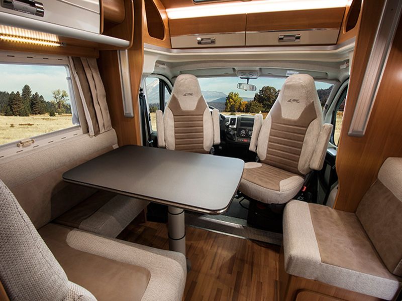 L’altezza interna di 2,10 m consente di avere pensili più ampi del 20% (fino a 54 cm di altezza), quattro ampi vani (di cui due con sportelli) sopra la cabina guida, e molti spazi di stivaggio anche nei bagni. Per non rischiare di inciampare, la zona living è priva di scalini, l’illuminazione interna è interamente a LED per tenere al minimo i consumi garantendo il massimo della resa, mentre il tavolo della dinette è posizionabile a piacere, per avere così ancora più posto nella zona giorno.