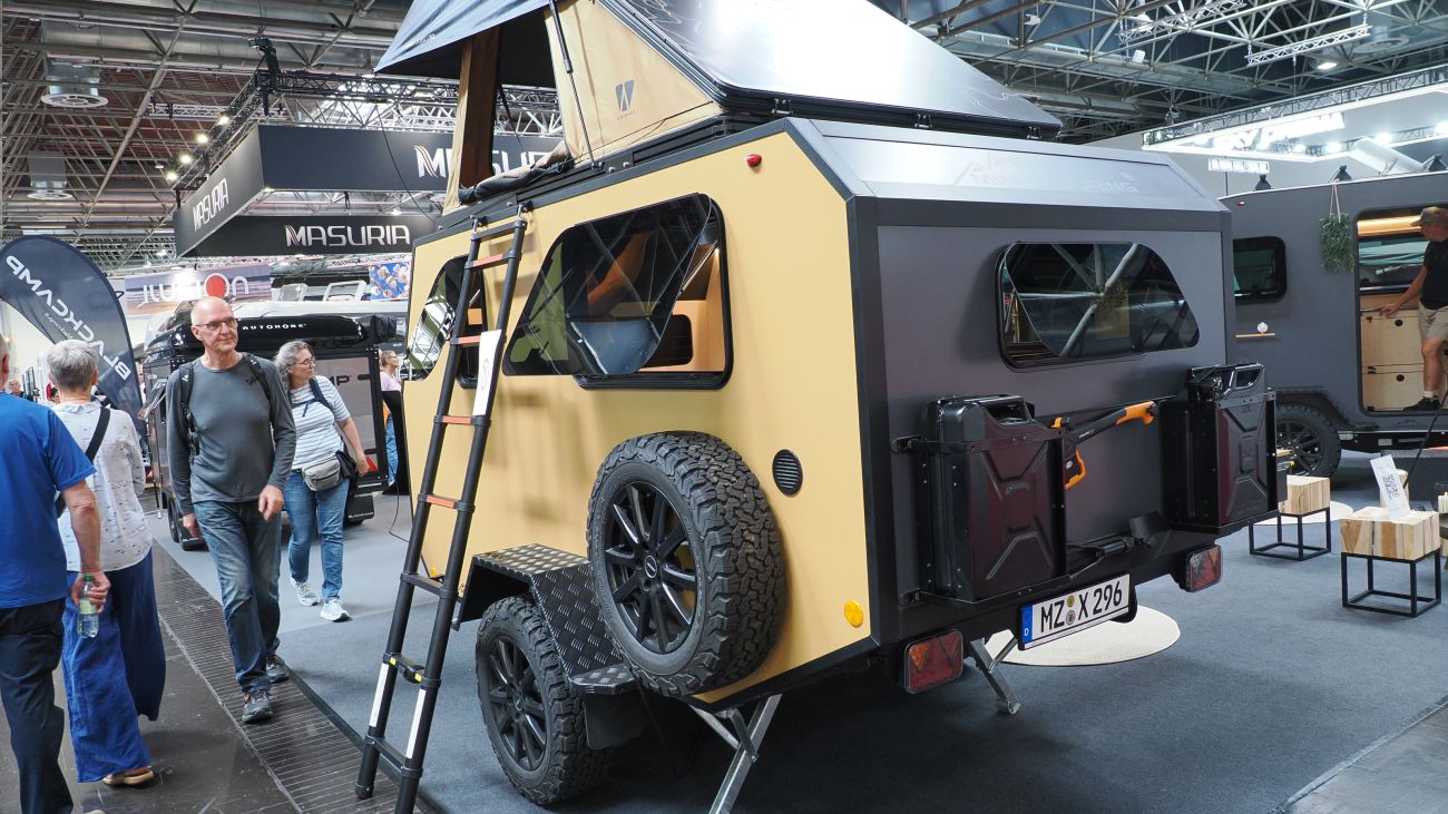 Chiunque stia pensando a un nuovo “alloggio” mobile dovrebbe trovare quello che cerca a Düsseldorf. Ad esempio, io ho visto un produttore con una tenda da tetto, completa di scala, a 1.043 euro che pesa 49 chilogrammi. Più vicino al suolo c'è una mini roulotte da campeggio. Anch'essa è composta da una sola camera da letto, che può ospitare due adulti. Il guscio esterno è realizzato in plastica rinforzata con fibra di vetro. La tenda a rotelle pesa 220 chilogrammi. Costa 6.290 euro.