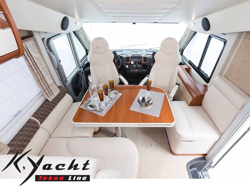 Per il K-Yacht Teknoline, doppio pavimento tecnico, pavimento riscaldato, cerchi in lega, bandelle in alluminio apribili con gavone, cruscotto bronzo con volante e pomello cambio in pelle, quadro strumenti con finitura cromata, oscurante parabrezza plissettati, sportelli pensili laccato lucido, piano cucina in pietra acrilica, ESP 9 (Traction,pneumatici all season) ABS – ASR. Per il Kea P Teknoline, doppio pavimento tecnico, cupolino con Sky dome integrato, chiusura centralizzata cabina e cellula, paraurti in tinta, skid plate e mascherina anteriore nera con DRL integrati, sedili girevoli con doppio bracciolo e sedile passeggero regolabile in altezza, tappeti cabina brandizzati, retrovisori elettrici, dotati di sbrinatore e antenna radio incorporata, bandelle apribili con gavone.