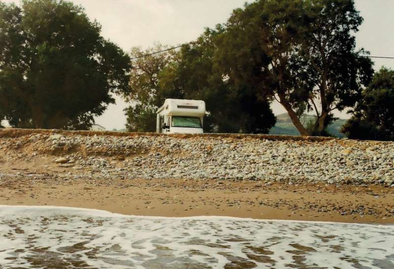 veniamo invitati a lasciare il parcheggio per il rispetto degli hotel e degli appartamenti della zona. È la prima volta in 6 anni di vacanze in Grecia che ci vien fatta una richiesta simile ma facciamo come ci viene detto. Ci rimettiamo in strada lungo la statale E65 e ci dirigiamo verso Kissamos percorrendo 38 km. Lungo la strada proviamo a scendere al mare in vari punti seguendo le indicazioni “beach”, ma nessuna stradina ci sembra percorribile finchè arriviamo a Kissamos. Qui troviamo una buona sistemazione tra gli eucalipti che ci fanno ombra per tutta la giornata (GPS: N35°32’29” E23°39’30”). Poco distante c’è il bar Kantina Omanolis che noleggia gli ombrelloni sulla spiaggia: spendiamo 6 euro e in omaggio abbiamo anche 2 bibite. Restiamo qui qualche giorno mangiando pesce fresco a 13 euro presso le taverne sul lungo mare. A proposito di mare: a causa del vento è sempre mosso ma il fondale è sabbioso, nonostante la spiaggia sia di sassi. Su quest’ultima tra l’altro c’è una doccia mentre per il carico/scarico bisogna andare al porto che dista soli 3 km. Qui si trovano anche un wc per uomini e uno per donne con docce. Sempre da questo porto si può partire per l’isola incantata di Balos ma, considerando che per arrivare a Creta abbiamo già navigato per un totale di 24 ore, decidiamo di “passare il turno”.