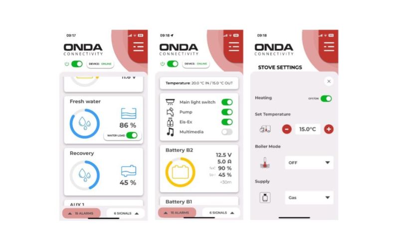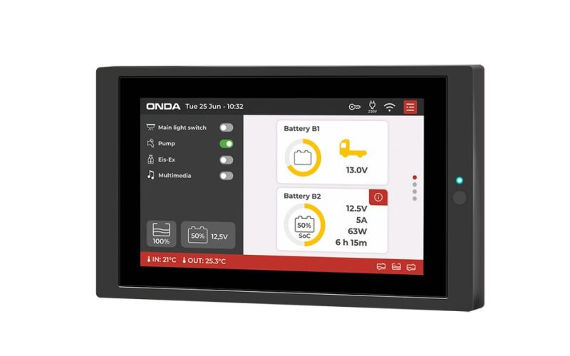 L’interfaccia è identica a quella dell’app ONDA, rendendo immediato il passaggio tra controllo da display e gestione da smartphone. In sostanza, i pannelli touch diventano il cruscotto digitale del camper, con tutto sotto controllo a portata di dito.