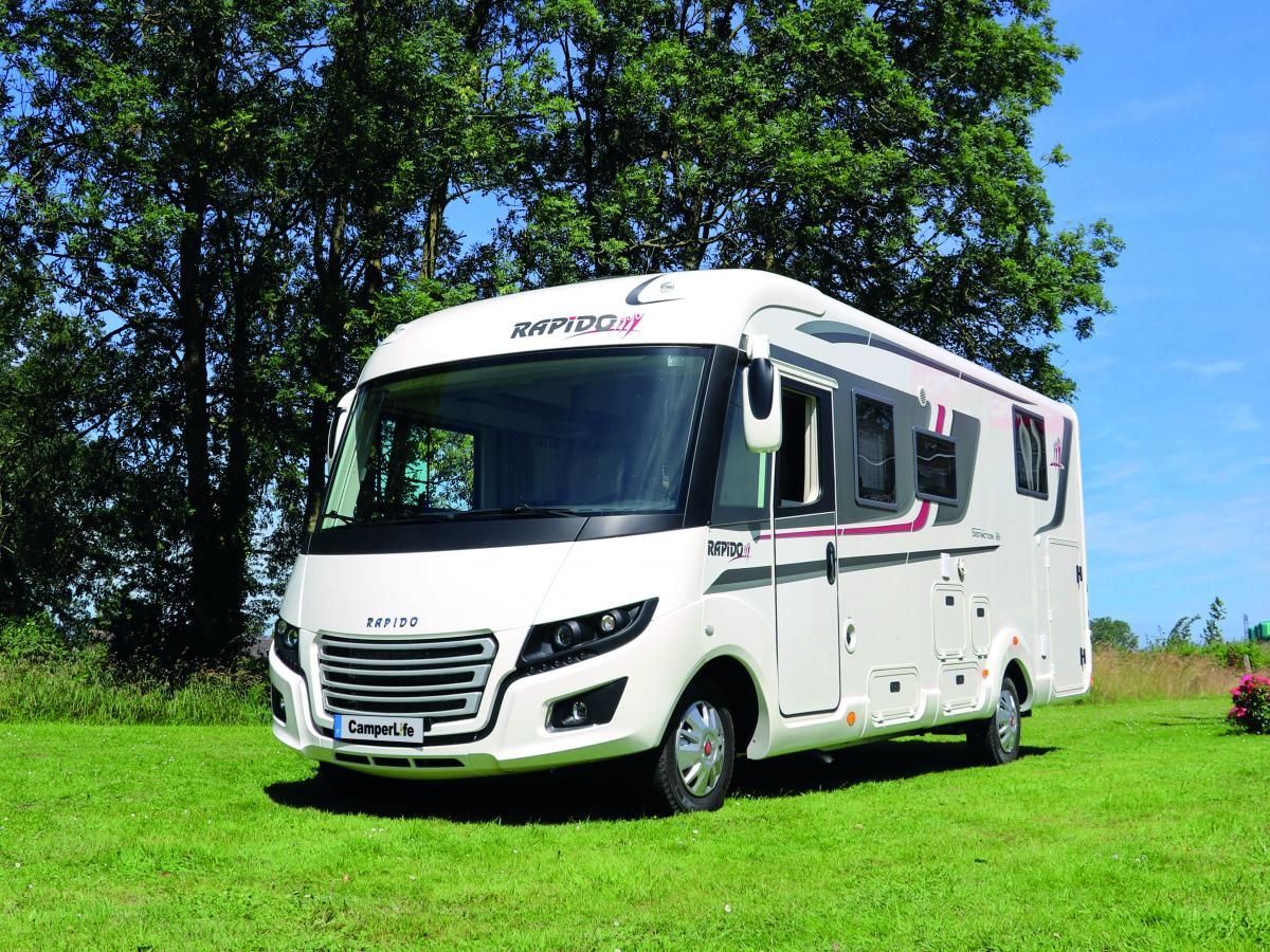 Una linea classica e molto apprezzata dal pubblico che cerca sicuramente, in questa fascia di mercato, qualcosa di tradizionale e rassicurante. Il frontale, completamente rinnovato nella stagione 2017, è dotato delle pratiche luci diurne a led che si sviluppano a sviluppo diagonale ai lati della calandra. Qualche decal grafica ravviva le fiancate con il logo Rapido sulla parte finale a “firmare” il motorhome, ben evidente anche sul frontale della cabina in posizione asimmetrica. Caratteristico il design della coda, che prevede quattro grandi gruppi ottici circolari, inseriti in carterini rossi separati sulla parete, e la terza luce di stop in alto, collocata su un carterino che abbraccia tutta la larghezza del camper includendo la telecamera di retromarcia e formando una sorta di cornice che “abbraccia” la parete posteriore fino al paraurti alleggerendo l’impatto ottico con grafiche dedicate.