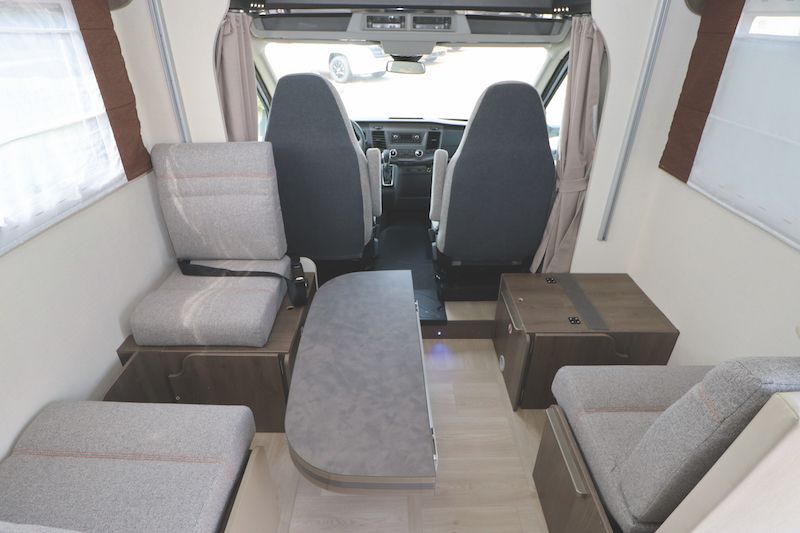 Entrando è subito evidente la spaziosa luminosità della zona anteriore in configurazione per la sosta, dove è possibile riunire più delle cinque persone previste dall’omologazione.