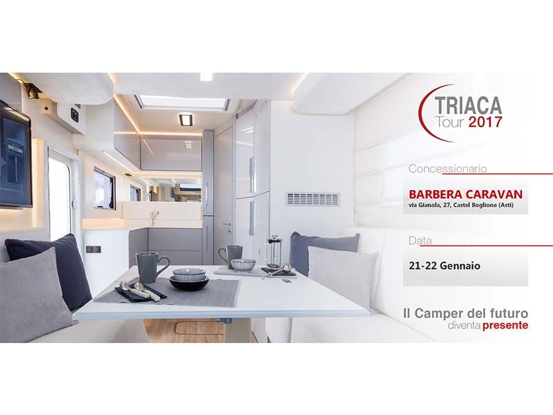 In particolare, nel weekend del 21 e 22 gennaio, è previsto uno speciale porte aperte presso Barbera Caravan in Via Genola 7 a Castel Boglione (Asti), dedicato all’esclusiva Roller Team 2017, Triaca 232 TL. Oltre che per l'occasione, il veicolo sarà disponibile presso la concessionaria fino alla fine di gennaio dove saranno in mostra le novità di questo semintegrale compatto destinato alla coppia, nato da un concept del 2015 oggi trasformato in produzione di serie. Il Tour Triaca continuerà poi, fino ad aprile, in altre località e concessionari d'Italia. Le prossime tappe su www.rollerteam.it