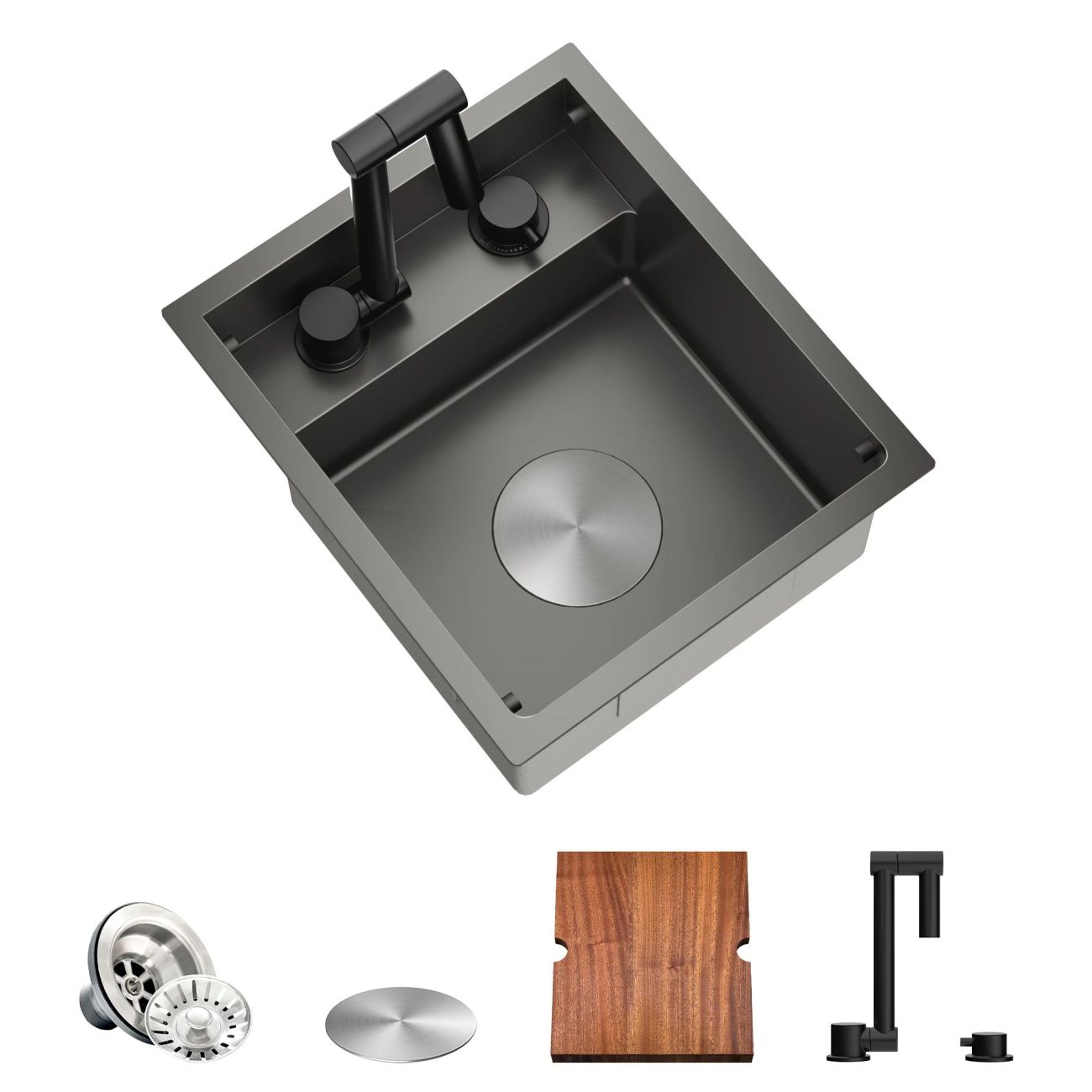 Il Torva RV1315R7NH è pensato come workstation sink: la vasca non è soltanto un punto di lavaggio ma una postazione modulare. Il tagliere in legno massello a misura scorre o si appoggia sul bordo e presenta scanalature laterali per afferrarlo e rimuoverlo al volo. È l’accessorio che trasforma la buca in un ripiano pieno, ideale quando il banco è corto. Nei materiali d’installazione forniti con il prodotto viene mostrato l’insieme degli accessori in dotazione (rubinetto, scarico, copripiletta, tavoletta/tagliere), così da verificare subito cosa comprende la confezione prima del montaggio.