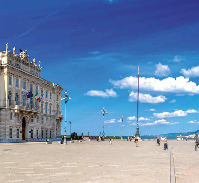 Arrivare a Trieste durante le belle giornate è un'esperienza purificante, quando il cielo è terso, cromato di quell'azzurro triestino, spazzolato dai venti della Bora, che oggi ci spingono letteralmente all'affaccio angelico e maestoso sulla piazza dell'Unità d'Italia. Con tutto il mare che ci abbraccia, la piazza, il cui nome in sole tre parole dice più o meno tutto della storia politica di questa città, vive da sempre il suo quotidiano fra mare e urbe, sospesa sul Golfo di Trieste come una terra piatta, dalla quale ci si allontana salpando dal famoso Molo Audace.