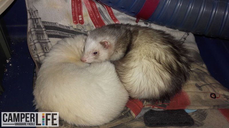 Quando si programma un viaggio con il proprio furetto è bene organizzarsi per tempo e assicurarsi che le vaccinazioni prescritte per legge (e necessarie in Italia o all’estero) siano valide. Come per cani e gatti, anche il furetto necessita di essere vaccinato contro cimurro canino che va effettuato a 8/10 settimane di età e ripetuto a 10/12 settimane. Il furetto è un animale molto sensibile e per il suo benessere durante il viaggio e la vacanza sarà necessario attrezzare il camper. Ecco alcuni consigli: creare una zona a lui dedicata delimitata da un recinto o da una gabbia spaziosa “a prova di fuga”e possibilmente di acciaio, che oltre a essere un materiale robusto è facilmente lavabile. Al suo interno posizioneremo una cassettina per i bisogni, una cuccia, una ciotola per il cibo e l’acqua e qualche giochino per scacciare la noia durante la nostra assenza. L’attitudine del furetto a dormire moltissime ore permette senza dubbio una gestione diversa rispetto a Fido consentendoci di poterci assentare per più tempo. Le dimensioni ridotte del furetto e la somiglianza con i roditori, però, non devono trarre in inganno: non è possibile relegare questo animale in una gabbietta alla stregua di un criceto. Il furetto infatti appartiene alla specie dei Mustelidi (Mustela Puturius Furo) e - come la puzzola, l’ermellino o il visone - è un predatore carnivoro che ama, quando sveglio, interagire e muoversi liberamente. All’assenza di stimoli alcuni soggetti reagiscono con apatia o sfogano questa repressione con l’aggressività. Curioso, giocherellone, vivace, ama nascondere il cibo e infilarsi in anfratti e tubi. Se lasciato libero non si può perderlo di vista e in camper certamente occorre qualche accortezza in più. Gli sportelli, i cassetti o peggio ancora gli oblò e le finestre aperte possono minare alla sua incolumità. In caso di fuga, i furetti smarriti non sanno ritrovare la strada di casa e in natura non riuscirebbero a sopravvivere perché dipendono completamente dall’uomo. Nei negozi di animali sono in vendita dei collarini e dei guinzagli adatti che consentono ai proprietari di avere sempre il controllo o di poterli portare a passeggio. Da ricordare inoltre che il furetto sopporta bene le temperature fredde ma è facilmente soggetto al raffreddore e molto sensibile al caldo. Durante l’estate bisogna porre estrema attenzione a correnti d’aria, sbalzi di clima e alte temperature che possono provocare il colpo di calore nonostante venga tenuto all’ombra. Infine qualche consiglio se i nostri vicini di camper hanno cani o gatti: il furetto con un buon carattere può tranquillamente convivere con altri animali da compagnia, purchè anch’essi equilibrati. Dotato di un’innata intelligenza può essere facilmente educato e addestrato. Va maneggiato con cura per non spaventarlo: se impaurito o molto eccitato potrebbe mordicchiare. Fondamentale per il buon carattere del furetto è il modo in cui è stato allevato e cresciuto. Se manovrato fin da cucciolo, imparerà subito l’inibizione al morso, importante in quanto si tratta di un animale carnivoro dotato dunque di denti appuntiti.