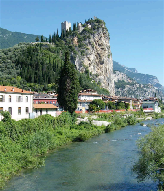 Dalla foce del Sarca, a Torbole, in prossimità del ponte parte una bella pista ciclopedonale che segue a ritroso il corso del fiume collegando così le sponde del lago alla Valle del Sarca. È la ciclopedonale Torbole – Sarche, lunga circa 25 chilometri con un dislivello in salita di 223 metri e un dislivello in discesa di 27 metri. Nonostante nella zona delle Marrocche di Dro presenti una breve salita del 10%, il percorso è di media difficoltà e sempre ottimamente segnalato. Dopo pochi chilometri di pedalata da Torbole si giunge rapidamente ad Arco, sovrastato da alte falesie diventate il regno di tanti appassionati di arrampicata. Il centro storico del paese è di prim’ordine, con la centrale via Segantini, Palazzo Marchetti con i suoi camini veneziani e palazzi rinascimentali ingentiliti da gerani. Il periodo di maggior raffinatezza di Arco coincide con i fasti dell’Impero Asburgico, che nella cittadina ha lasciato una forte impronta sul finire dell’Ottocento. È in quel periodo che Arco si trasforma in luogo di cura invernale, grazie alla mitezza del clima che ancora oggi lo contraddistingue e grazie all’arciduca Alberto d’Austria, cugino dell’imperatore Francesco Giuseppe, che decide di stabilire qui la sua residenza invernale con tutta la sua corte. La morte dell’arciduca e ancor più lo scoppio della Prima guerra mondiale pongono fine al periodo d’oro della stazione climatica. Testimone di più antiche vicende è il Castello, imponente e romantico, sospeso a mezz’aria sulla rupe che fa da sfondo alla cittadina e che ne rappresenta l’inconfondibile skyline. Fu eretto nell’anno Mille e si trova in posizione panoramica sulla piana del fiume Sarca, fra cipressi secolari. Dal centro storico di Arco, disteso ai suoi piedi, si sale al Castello in circa mezz’ora; l’ultimo tratto è in decisa salita. Le vestigia della fortezza sono visitabili tutto l’anno (info Comune di Arco tel. 0464/510156).
