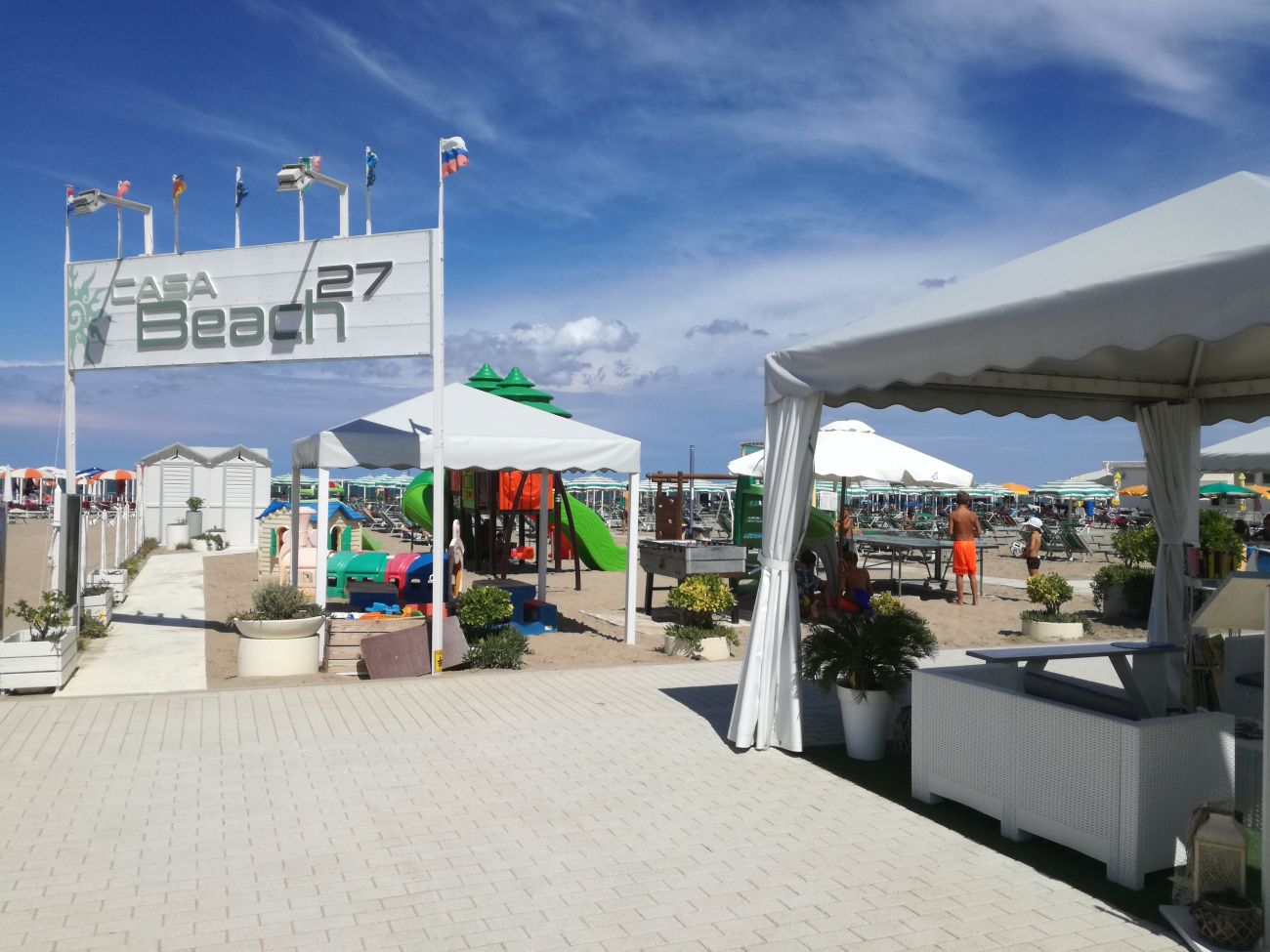 Lo Stabilimento balneare numero 27 (CASA BEACH 27) situato a Riccione in prossimità del Camping Adria e circa a 200 metri dal International Riccione Camping Village. La spiaggia, rinnovata completamente nel 2016 in ogni particolare, offre i seguenti servizi: area per cani di piccola e media taglia (in apposite aree riservate); servizio wi fi gratuito per i clienti; campo da beach volley, beach tennis e foot volley utilizzabile anche nelle ore serali; area giochi per bambini, completa di biliardino, tavolo da ping pong e zona coperta per attività ludiche; area relax coperta con divanetti, giornali e tv; docce calde gratuite; cabina con doccia calda; cabina con frigo e forno microonde; cabine spogliatoio; nursery-fasciatoio; area pic-nic coperta; parcheggio gratuito; spiaggia è attrezzata per l'accesso alle persone con disabilità.
