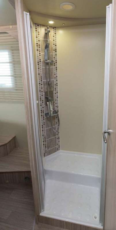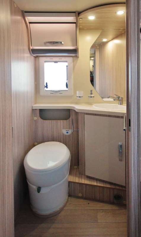 In posizione centrale, è divisa in due parti piuttosto ampie, prevede la rotazione della porta della toilette verso il living per separare la suite in coda dal resto del veicolo. La zona tra le due parti del bagno forma anche una sorta di spogliatoio, piuttosto spazioso. La doccia dispone di una cabina separata ben rifinita, con elegante colonna angolare perfezionata da un motivo di decoro tipo mosaico, dotata di saliscendi regolabile e un ripiano cromato per i saponi. La zona water è completamente rivestita in legno per la parte degli arredi, rifinita con attenzione e cura dei particolari. Il lavello angolare, a forma ovale, è inserito su un piano che corre anche dietro al water a cassetta e prevede due staffe cromate con i bicchieri in vetro satinato. Due gli armadietti a disposizione, uno sotto al lavello di grandi dimensioni, l’altro è sopra alla finestra con una forma semicurva del pensile, molto elegante; un altro piccolo vano a giorno dietro al wc completa gli spazi disponibili. Grande lo specchio sulla parete, dotato di due potenti faretti a LED. La ventilazione è affidata alla finestra per la parte wc e ad un aeratore per la cabina doccia.